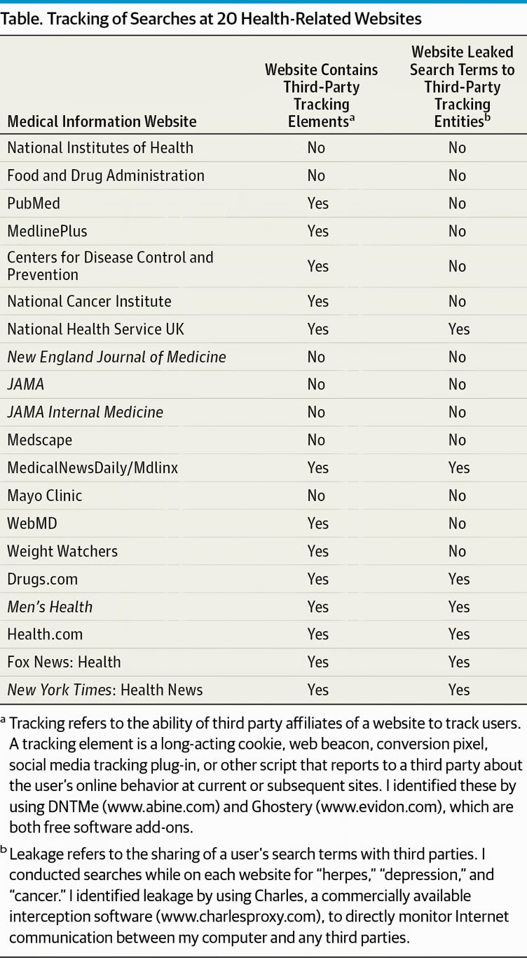The research letter was recently published in JAMA Internal Medicine entitled “Privacy Threats When Seeking Online Health Information” and looked at how 20 health-related websites track visitors, ranging from the sites of the National Institutes of Health to the health news section of The New York Times online. Thirteen of the sites had at least one potentially worrisome tracker, according to the analysis performed by Dr. Huesch.